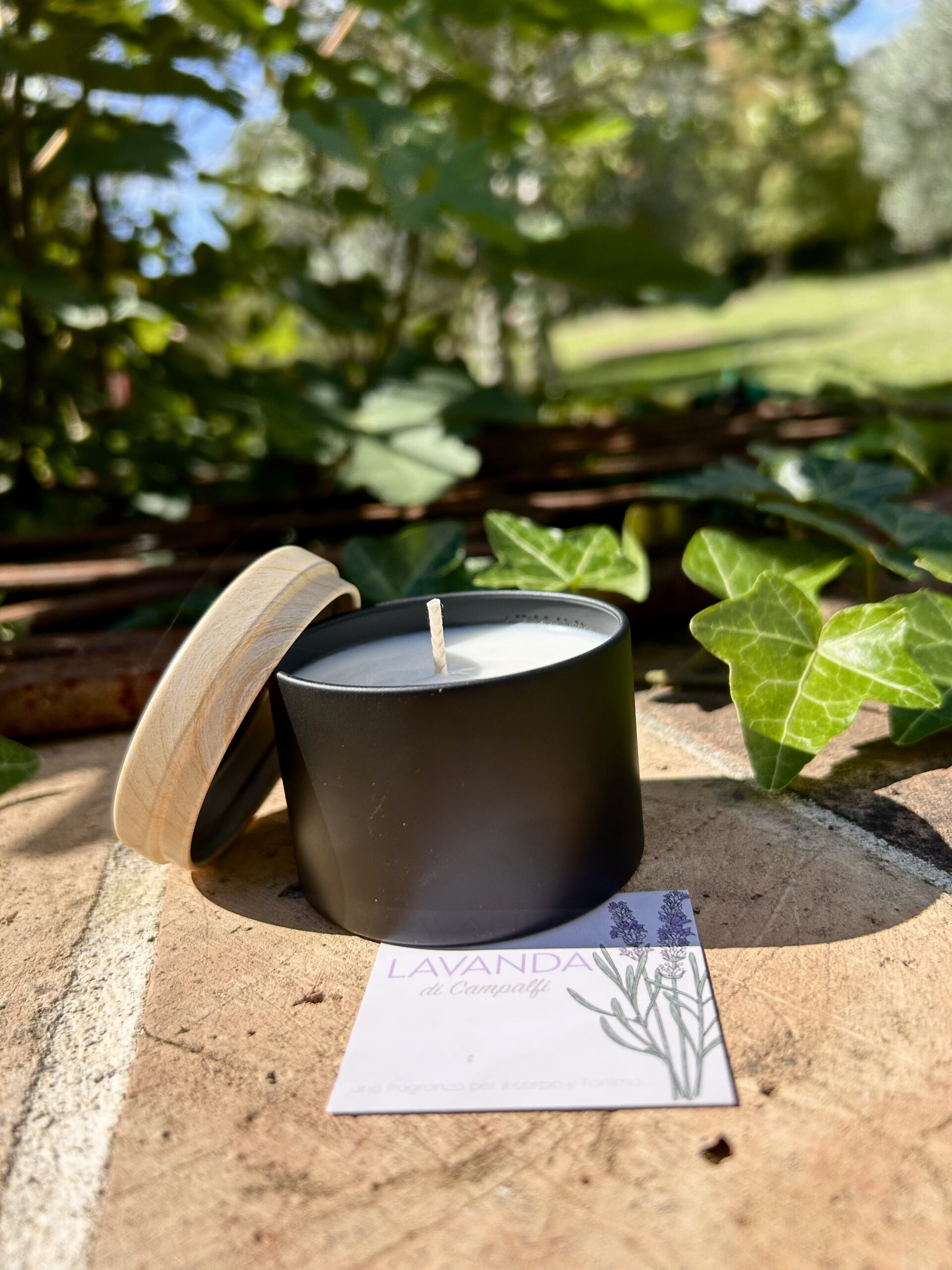 In einem eleganten schwarzen Metalldöschen mit Holzdeckel-Optik verpackt, bringt sie ein Stück toskanische Gelassenheit in dein Zuhause.